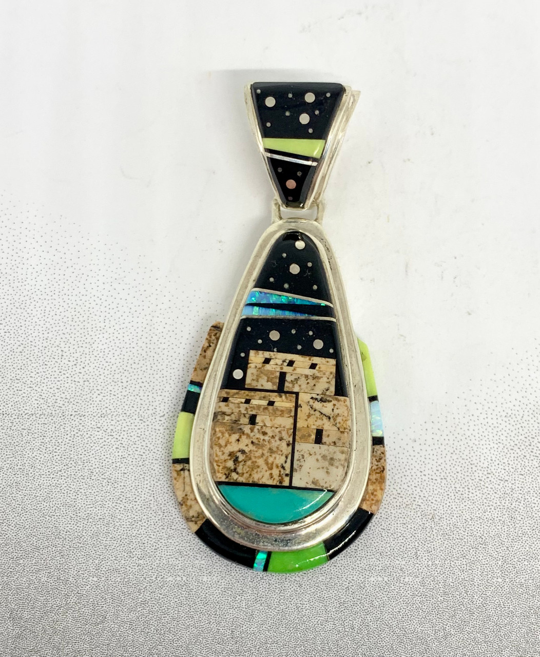 Stunning Calvin Begay inlay pendant. This pendant features a night sky design and has Onyx, Mother of Pearl, Turquoise, Jasper, man made Opal, and Gaspeite.