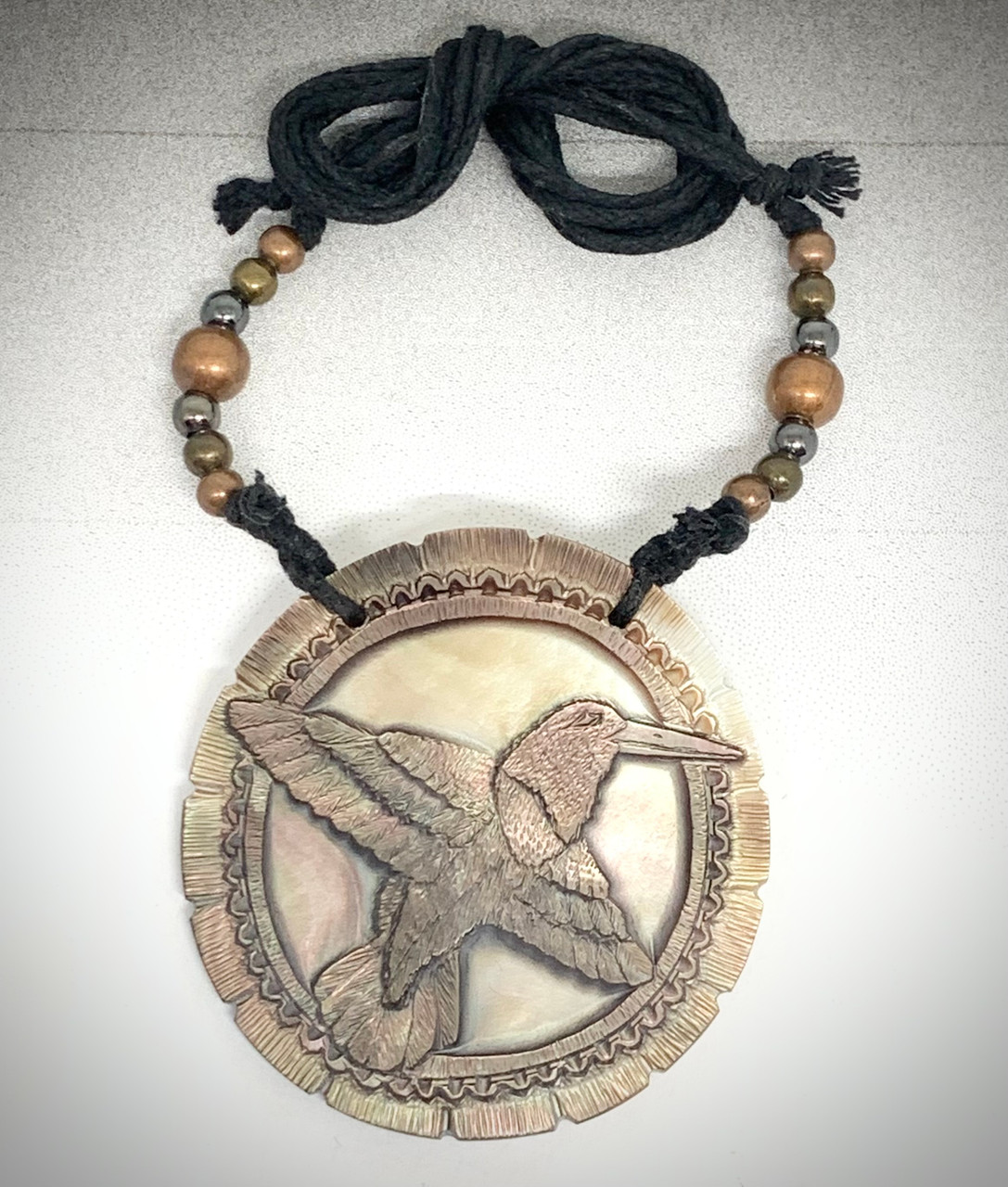 This one of a kind shell gorget measures 1 3/4" in diameter.