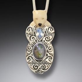 Stunning fossilized mammoth ivory bear pendant with accents of rainbow moonstone and labradorite. The ivory is found in the ground in Alaska and Canada and can be as old as 5,000 years. Colors will vary as each beautiful piece of ancient ivory is uniquely tinted by earthen minerals. The pendant is sterling silver and measures 1 1/2 x 3/4"and was designed in New Zealand and handcrafted in Bali.