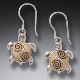 Beautiful fossilized walrus baby sea turtle earrings. The ivory is found in the ground in Alaska and Canada and can be dated back anywhere from 500 to 5,000 years old. Colors will vary as each beautiful piece of ancient ivory is uniquely tinted by earthen minerals. The earrings are set in sterling silver and the turtle measures 3/4" long. Designed in New Zealand and made in Bali, Indonesia.