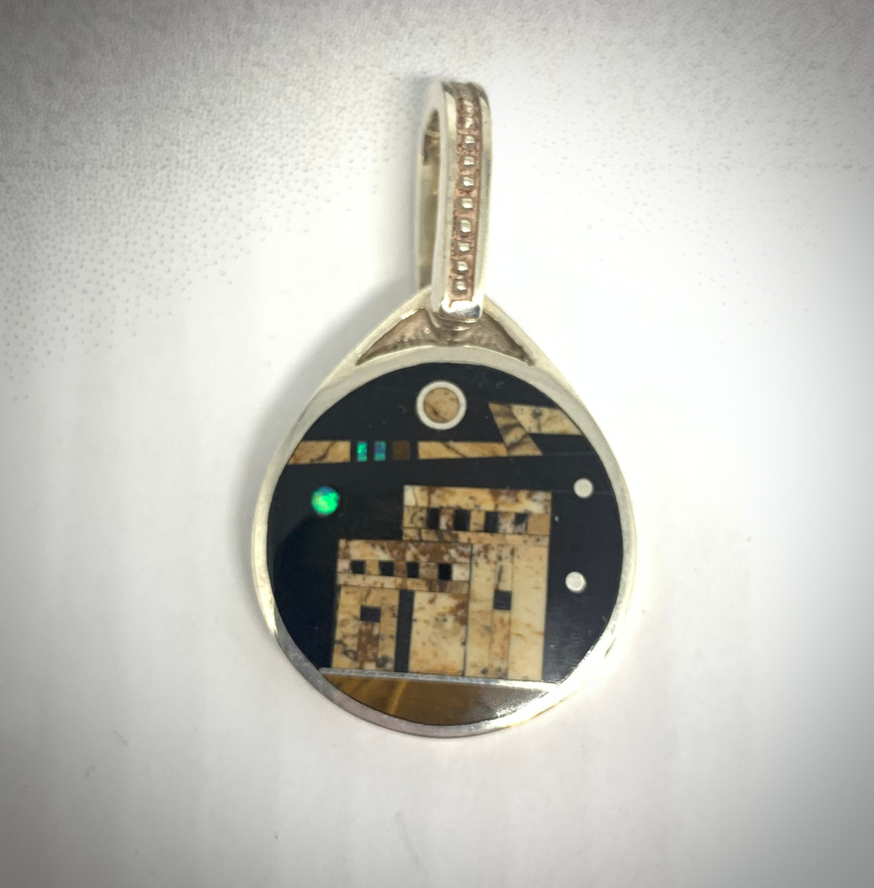 Beautiful and intricate night scene inlay pendant designed by artist David Rosales. Black Onyx, Mother of Pearl, Picture Jasper, and man made Opal are all used in this piece. It is proudly Native made in the USA and set in sterling silver. The pendant measures 1 1/4" x 3/4" and has a very unique bail to accentuate the pendant.