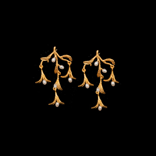 Stunning Night Willow earrings by artist Michael Michaud. These are made out of a mold of the real plant and then cast in sterling silver and plated in 24 K gold. They're accented with freshwater pearls.