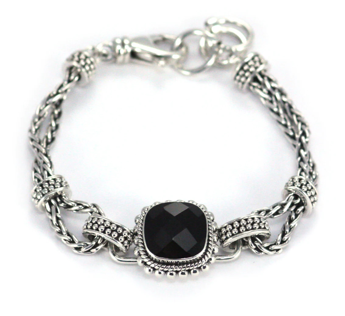 Beautiful and classic faceted Black Onyx bracelet. It is sterling silver and has an adjustable length of 7 to 8" with a lobster claw clasp closure. Hand-crafted in Bali.