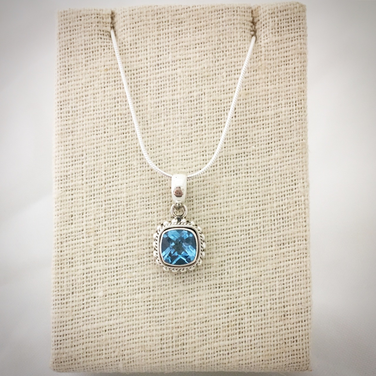 Beautiful Bali-style Sterling Silver and Blue Topaz pendant on a snake chain. Pendant measures approx. 5/8" long from the bottom of the bail. Handcrafted in Indonesia.