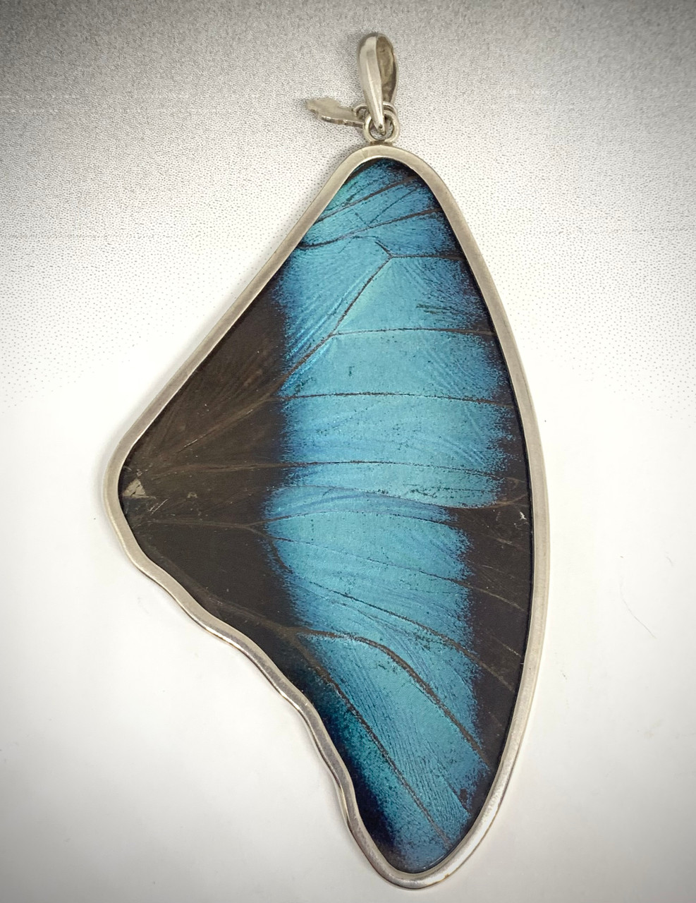 Beautiful and big butterfly wing pendant. This piece is incredible! It measures 3 1/4" x 1 1/4". You are sure to make a statement with this piece.