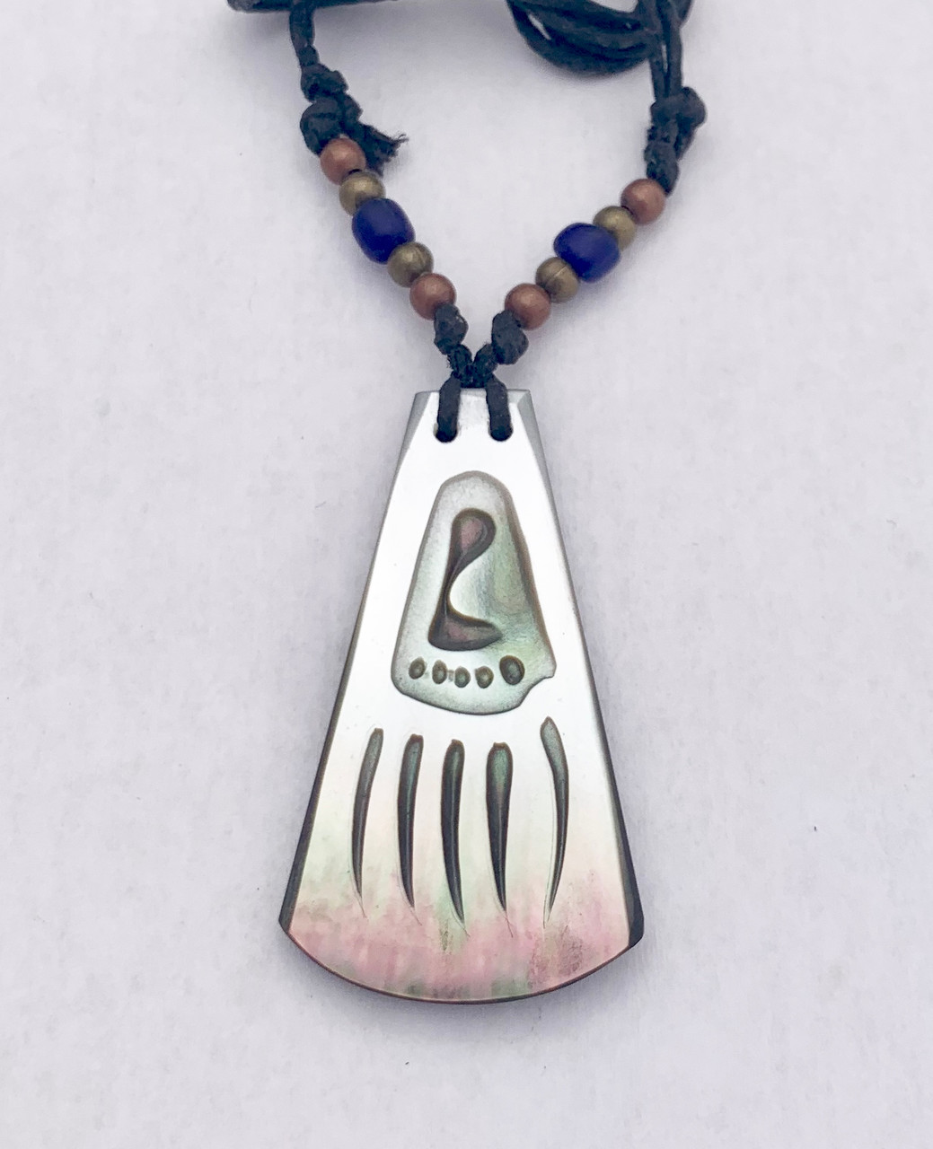 This one of a kind hand-carved shell gorget measures approx. 2" long.