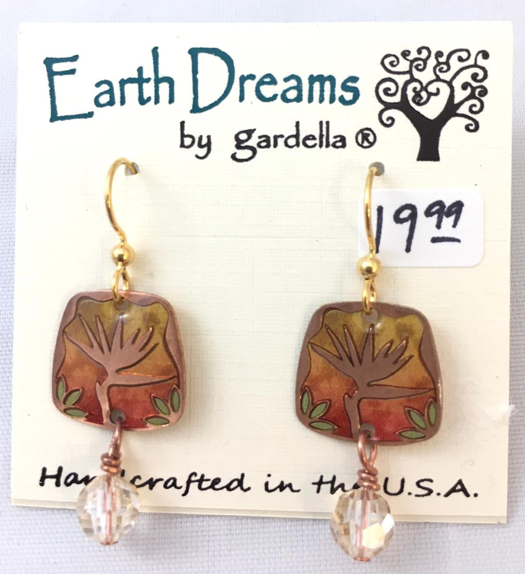 Earth Dreams designs are silver, bronze or copper plated brass with Czech or Swarovski Crystals. The ear wires are plain or gold plated surgical steel. Earrings measure 1-1/2" long, including ear wire. Handcrafted in the USA!