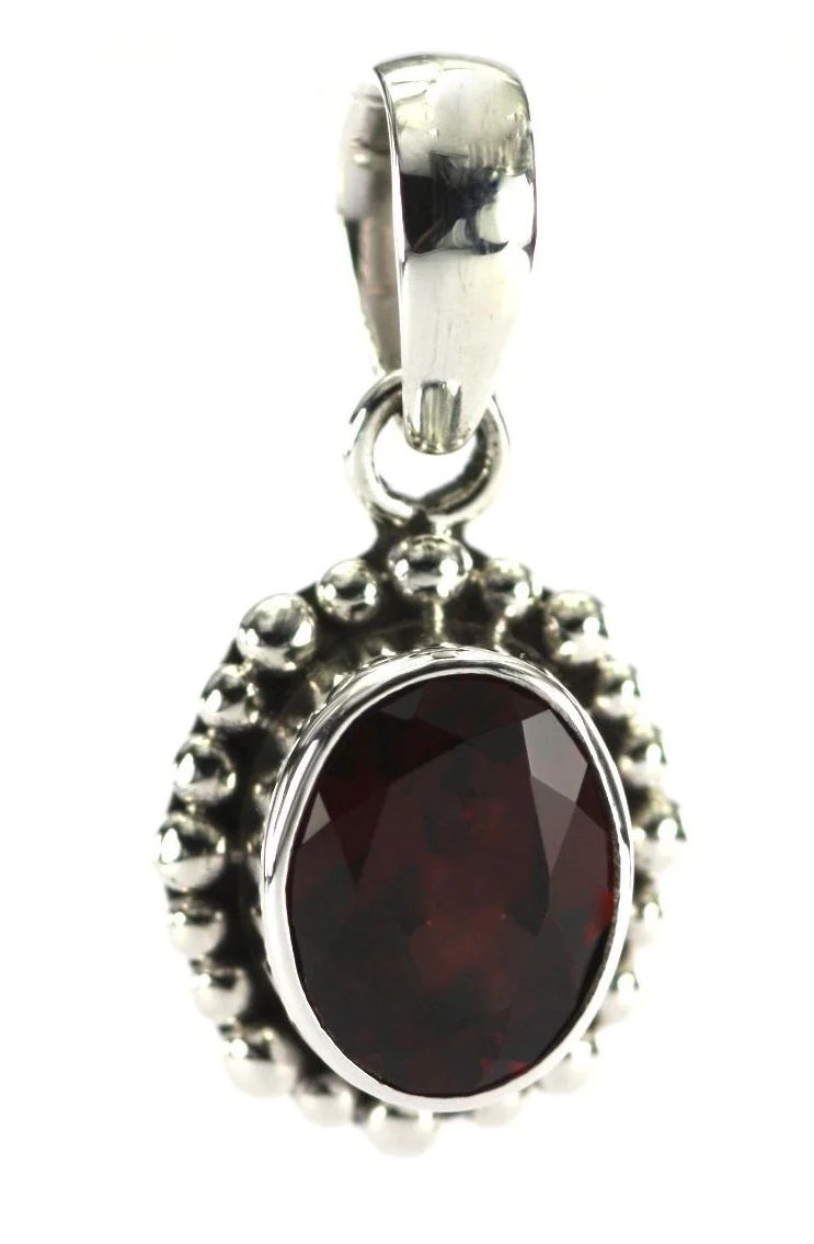 Beautiful oval shaped Garnet necklace with granulation around the stone. The stone measures 9x7mm and comes with a sterling silver chain so please choose your desired length. Made in Bali.