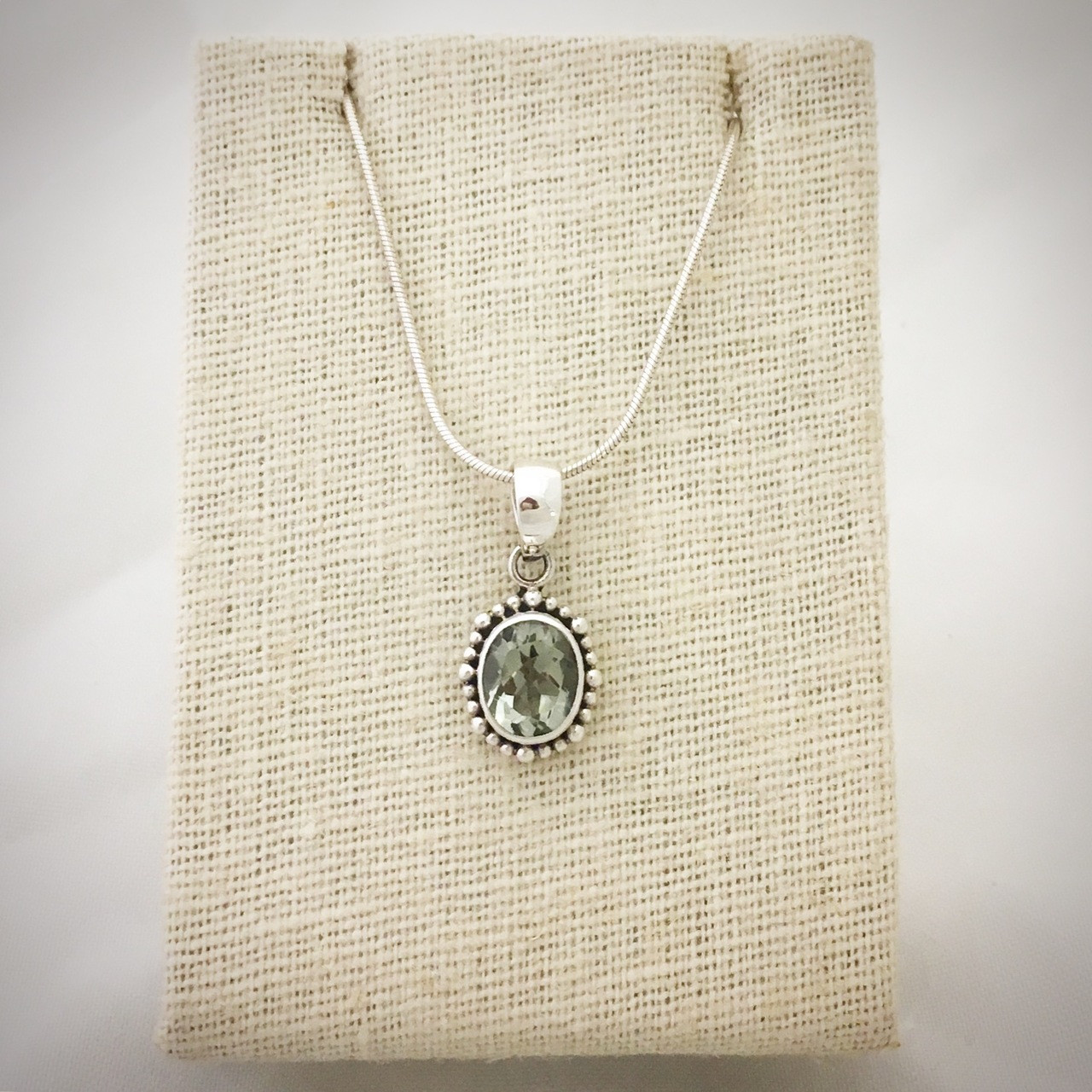 Beautiful Bali-style Sterling Silver and Green Amethyst pendant on a snake chain. Pendant measures approx. 3/4" long from the bottom of the bail. Handcrafted in Indonesia.