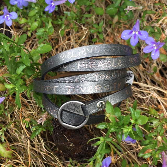 This is a "Feather Project" fundraiser item! See our tab on the top of the page for more information on The Feather Project. The manufacturer, Good Works, is a cause-based company giving globally. And since The Feather Project gives locally, this truly is a win-win! This trendy wrap bracelet has the words "Plant Peace", "Live in unity", "Dream", "Believe", "Strength". "Fearless", "Blessed", "Faith", "Love", and many more.
