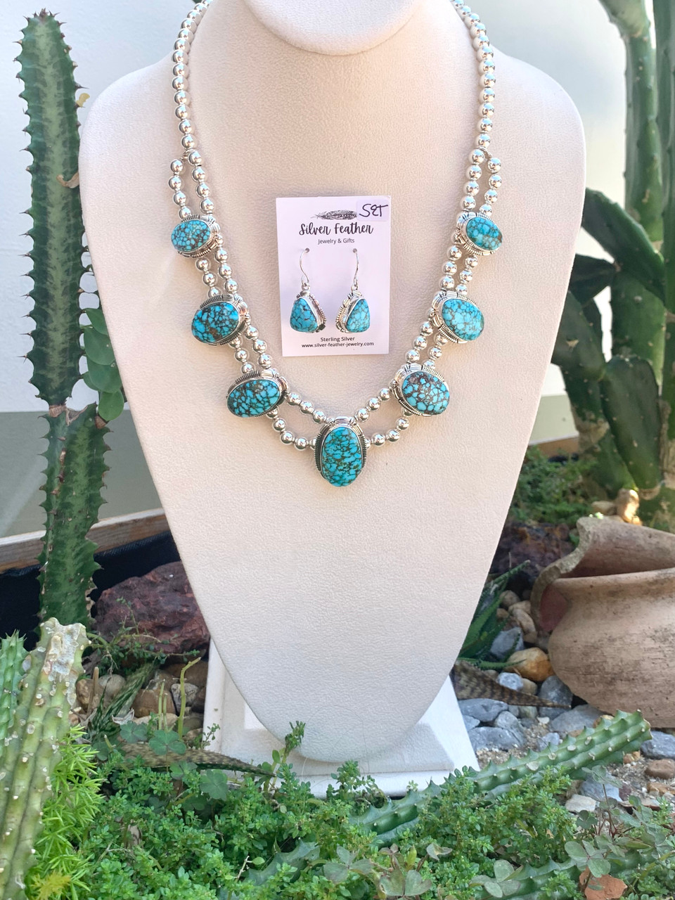 A beautiful necklace and earrings set! This sterling silver set is with gorgeous Kingman Turquoise and is handmade by Navajo artist Larry Yazzie.