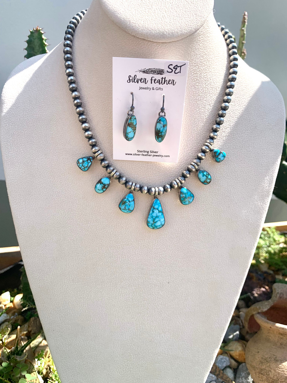 Absolutely gorgeous and vivid Kingman Turquoise necklace and earring set. Set in oxidized sterling silver, the necklace has 7 stones strung on a Navajo Pearl necklace.