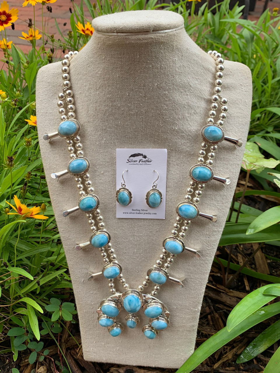 Larimar adorns this stunning squash blossom necklace set. Made and hallmarked by Navajo artist Thomas Francisco, it measures approximately 24" long with a 2-1/2" Naja hanging from the center. Set includes necklace and earrings. The "naja" is one of the main features of a traditional squash blossom necklace. It is designed after a Moorish symbol to ward off "the evil eye" and brought to the Americas by the Spaniards who adorned their horses with the symbol on their bridal or chest plate. The Navajo adopted the symbol and created their own ideas about it's design and meaning. The blossoms, styled after the adornments on Spaniard's clothing became another part of the necklace, and combining the two became the beautiful and intriguing squash blossom necklace. You can find these Navajo necklaces being made as far back as the late 1800's.