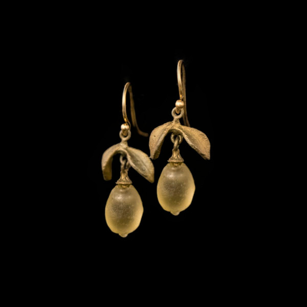 Beautiful lemon earrings designed by artist Michael Michaud. These earrings are hand cast glass and hand patinaed cast bronze of the plant.