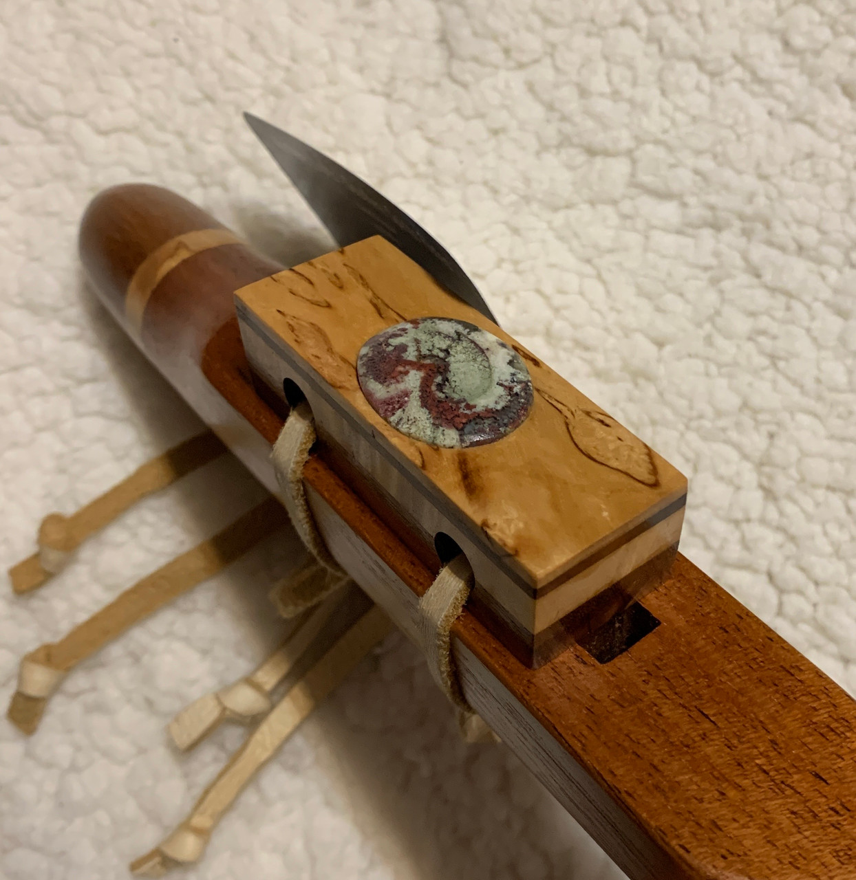 Beautiful handmade flute by Dan Arrington of "Northern Lights-Southern Spirit Flutes". This is a six hole flute in the key of "G". The main body is Tasmanian Blackwood which is a dense, heavy wood. It is accented by a phenomenal layered block of contrasting colors of exotic woods (which he names on the attached card) and a wonderful pale green and red jasper cabochon. Dan has been making Native American Style flutes since 2005 and can be found most every April at the Musical Echoes Native American Flute Festival in Ft. Walton Beach, Florida.
