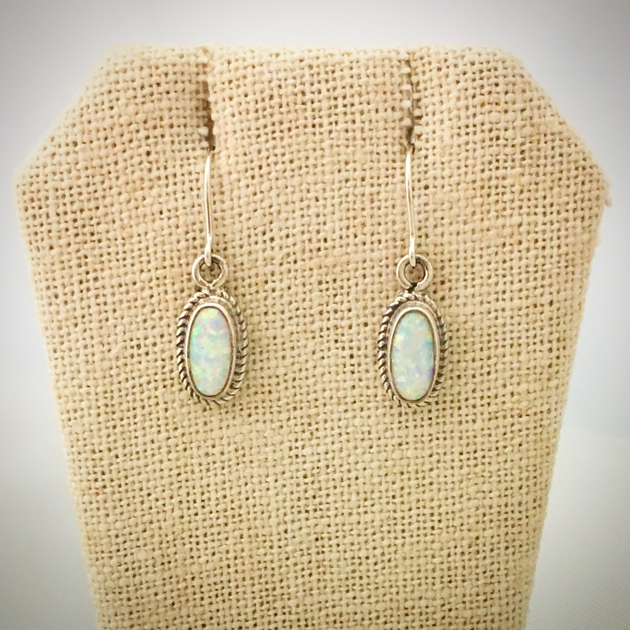 Beautiful, fiery cultured Opals set in Sterling Silver. Earrings measure 5/8" long from the bottom of the ear wire. Handcrafted in the USA by Navajo artist Berna Francisco!