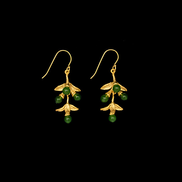 Gorgeous Pepper plant wire earrings designed by artist Michael Michaud. These earrings are cast hand patinaed bronze with 24K Gold finish and accented with Green Jade.