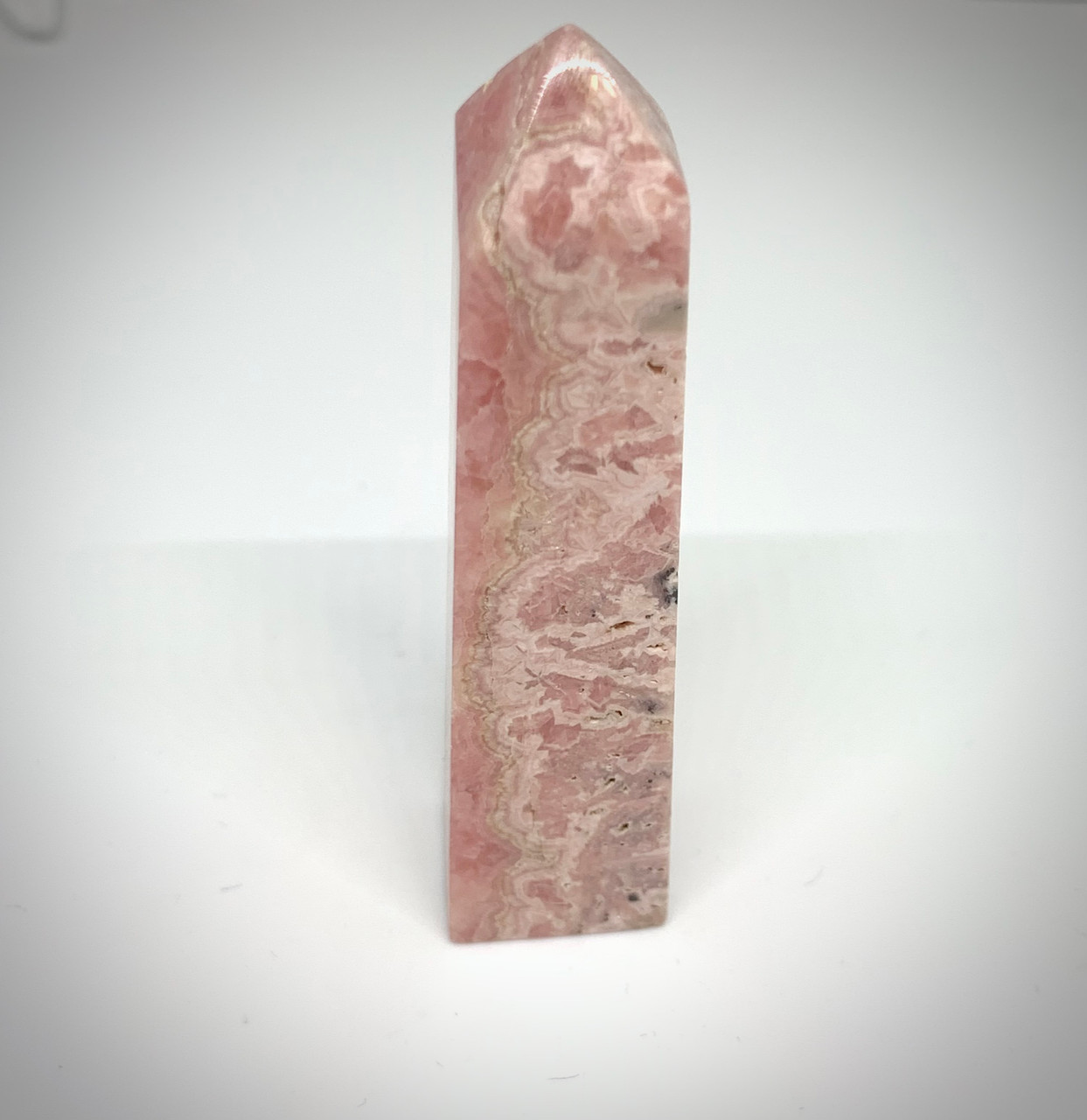 Beautiful banded Rhodochrosite tower with several rosettes in the polish.