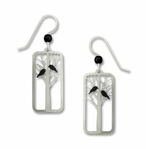 Simple and sweet Sienna Sky earrings. Metal cut trees with two black ravens sitting in the branches make the perfect pair of earrings for any nature lover. They are accompanied by hypoallergenic sterling silver ear wires and are a 3/4" long with ear wire. Proudly made in the USA.