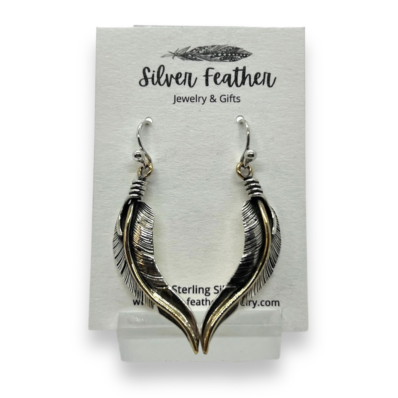 Beautiful sterling silver feather earrings with a 12kt gold fill vein through the middle of the feather. These earrings are Native American handmade. They measure about 2" long, even with the curve of the feather.