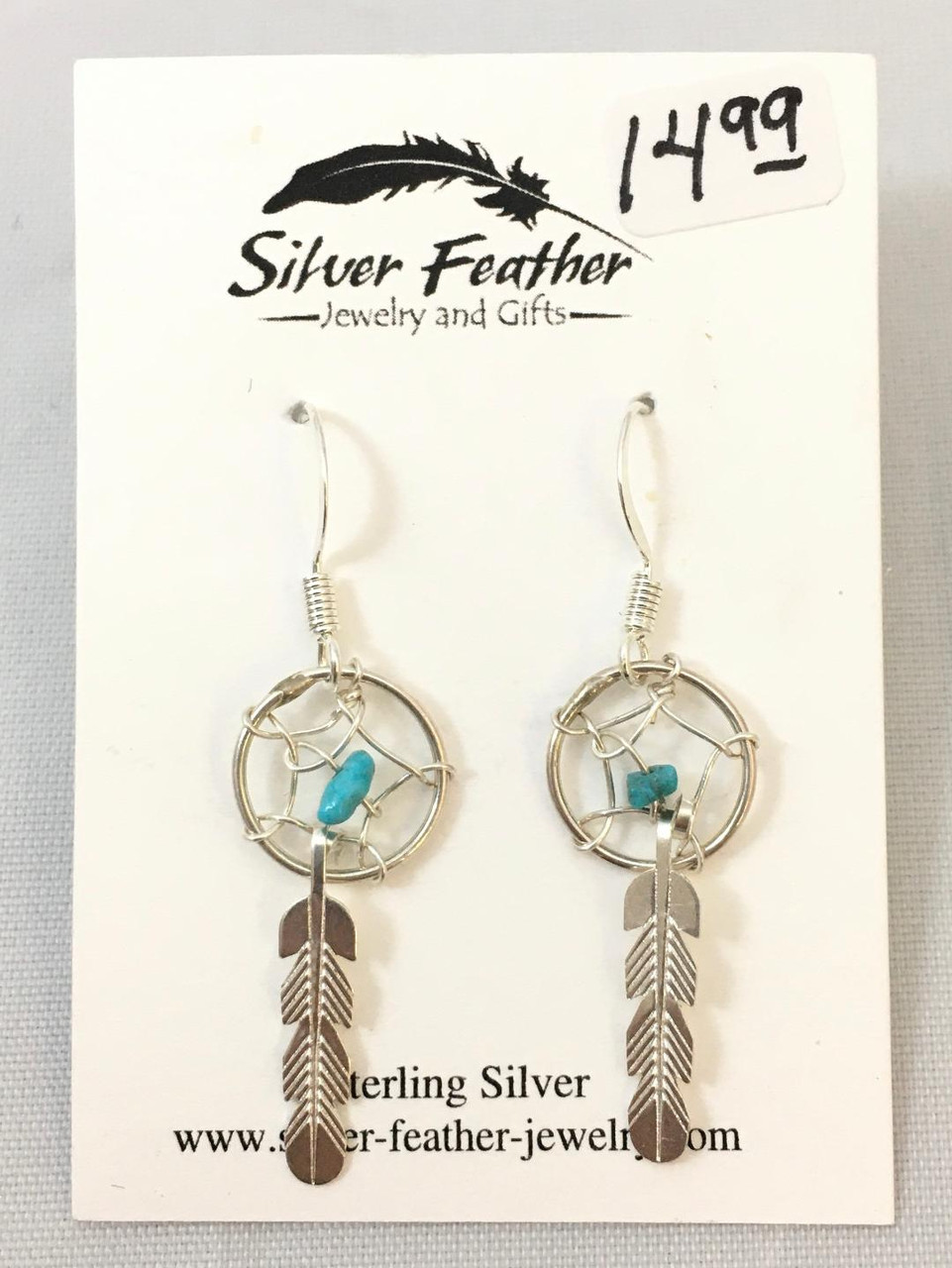 Sterling silver and turquoise 'Dream Catcher' earrings with feathers. Earrings measure 1-5/8" long including sterling silver ear wire. Handcrafted in the USA!