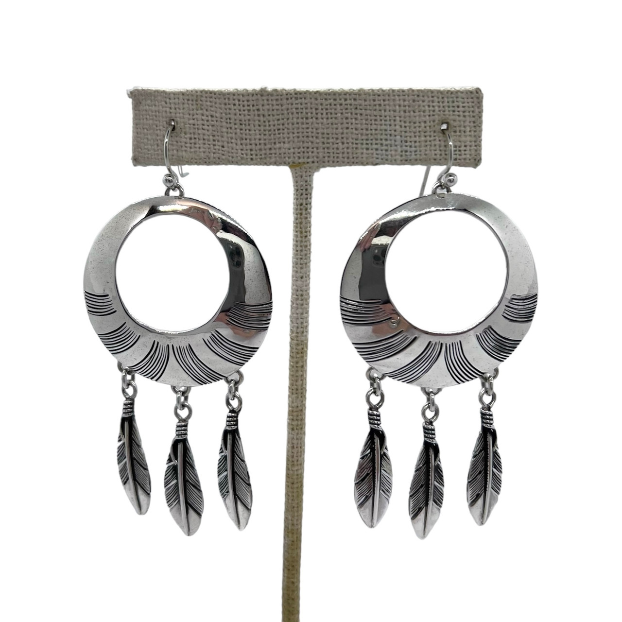 Stunning sterling silver earrings. These earrings are large circles, measuring 1 1/2" wide with beautiful stamp work and each earring has 3 feathers dangling from it. These earrings are a statement piece and have great movement! They are 3" long from wire to bottom of the feathers.