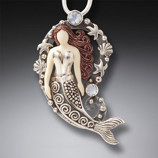Beautiful sterling silver mermaid pendant. This pendant has hand carved fossilized mammoth ivory for the mermaid's body and hair and then is accentuated with beautiful faceted Rainbow Moonstone. This piece is a mermaid lover's dream and is wearable art. The fossilized ivory was excavated from the ground and is thousands of years old. This piece is one of a kind, made by artist Jenny Byrne. Being one of a kind--the ivory may differ in color slightly. The pendant is 1 3/8" by 2" long.
