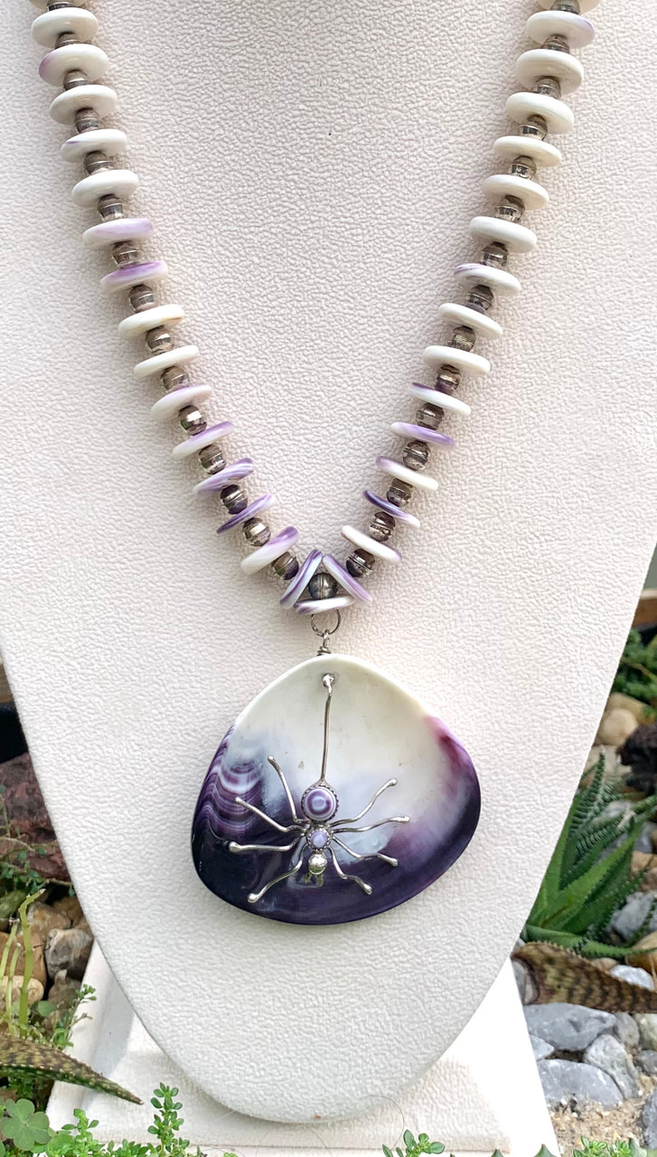 Beautiful and unique genuine Wampum shell necklace with dangling sterling silver spider in the middle of the shell.