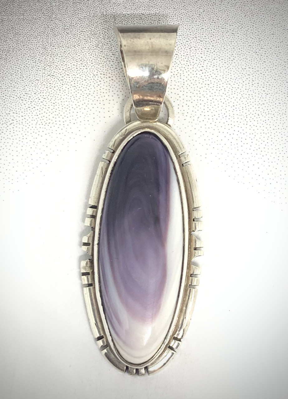 Lovely Wampum Shell pendant. Set in sterling silver, this pendant measures about 2" x 1/2".