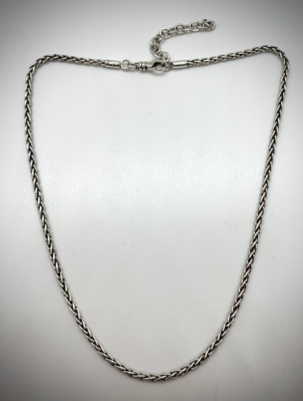 Sterling silver handmade chain from Bali. This chain lends itself well to many of the natural stone pendants that we sell. At 2.5mm wide it is substantial enough to look appropriate with a larger pendant small enough to fit a smaller bail. It has a lobster claw clasp for security and a 2" extender for your convenience.